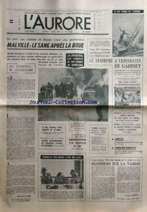 AURORE (L') [No 10225] du 01/08/1977 - MALVILLE / LE SANG APRES LA BOUE - LES RETOMBEES DE L'ANTI-NUCLEAIRE PAR JAMET -SESSION EXTRAORDINAIRE DU PARLEMENT POSSIBLE EN SEPTEMBRE -LE MEURTRE DE FIONA LA JEUNE ANGLAISE / ARRESTATION D'UN CHAUFFEUR DE TAXI -1ER MINISTRE WILSON ETAIT ESPIONNE PAR SES PROPRES SERVICES / PLOMBIERS SUR LA TAMISE PAR BERNERT -PROCHE-ORIENT / CYRUS VANCE Y DEBARQUE AVEC DES OBJECTIFS LIMITES -LES CONFLITS SOCIAUX -LES SPORTS / LA COURSE DE L'AURORE / MALINOVSKY - GAHIN